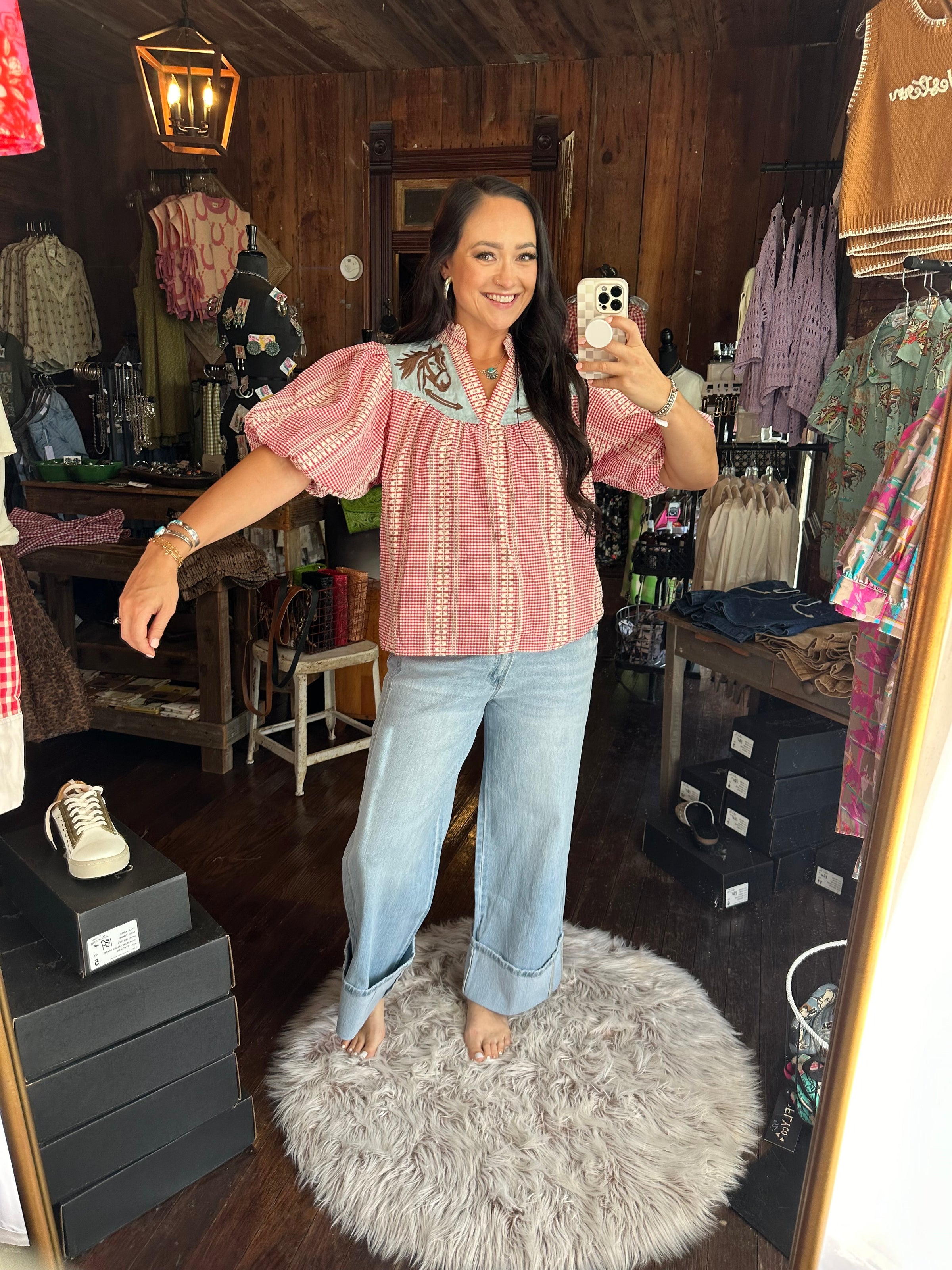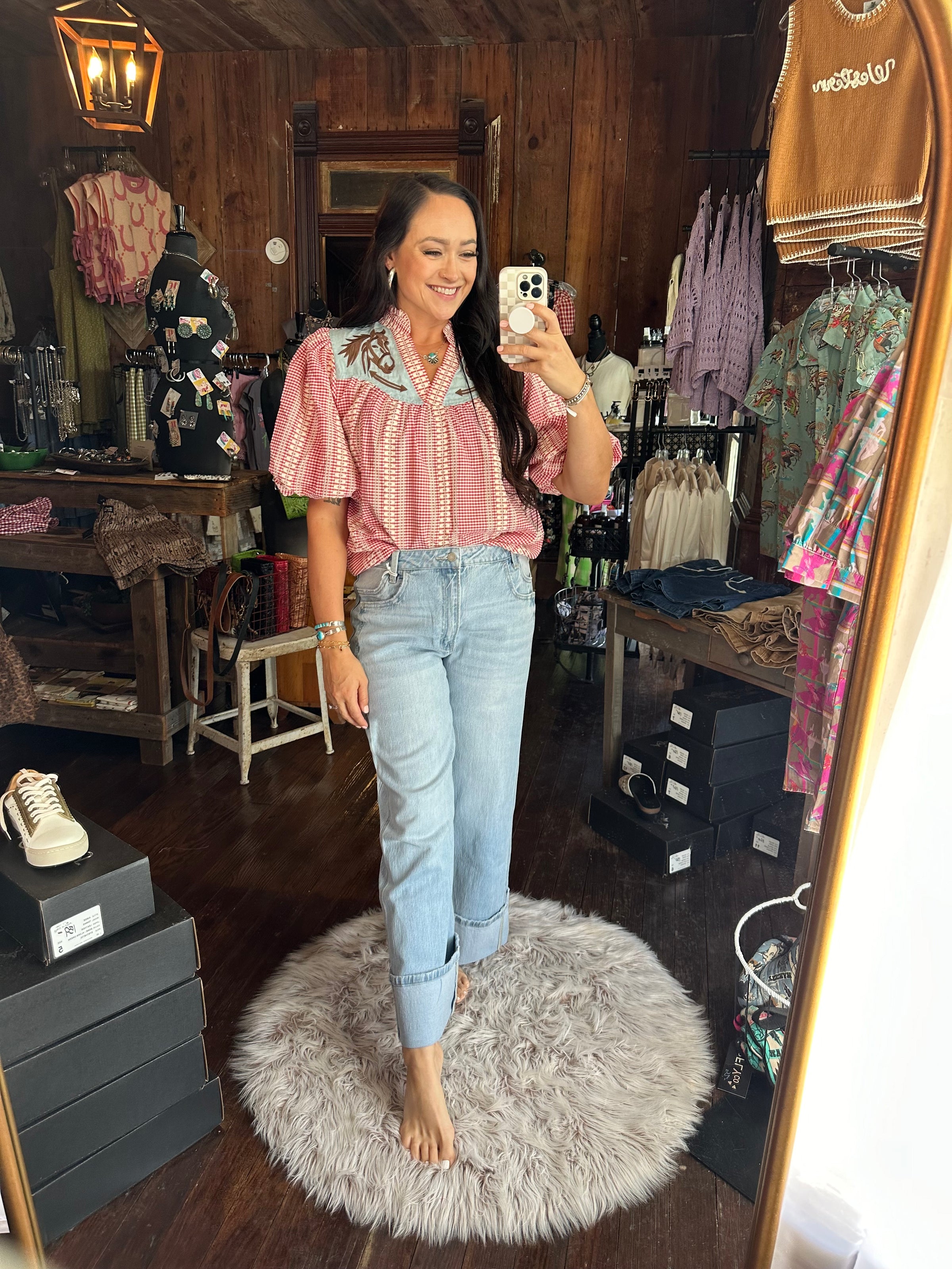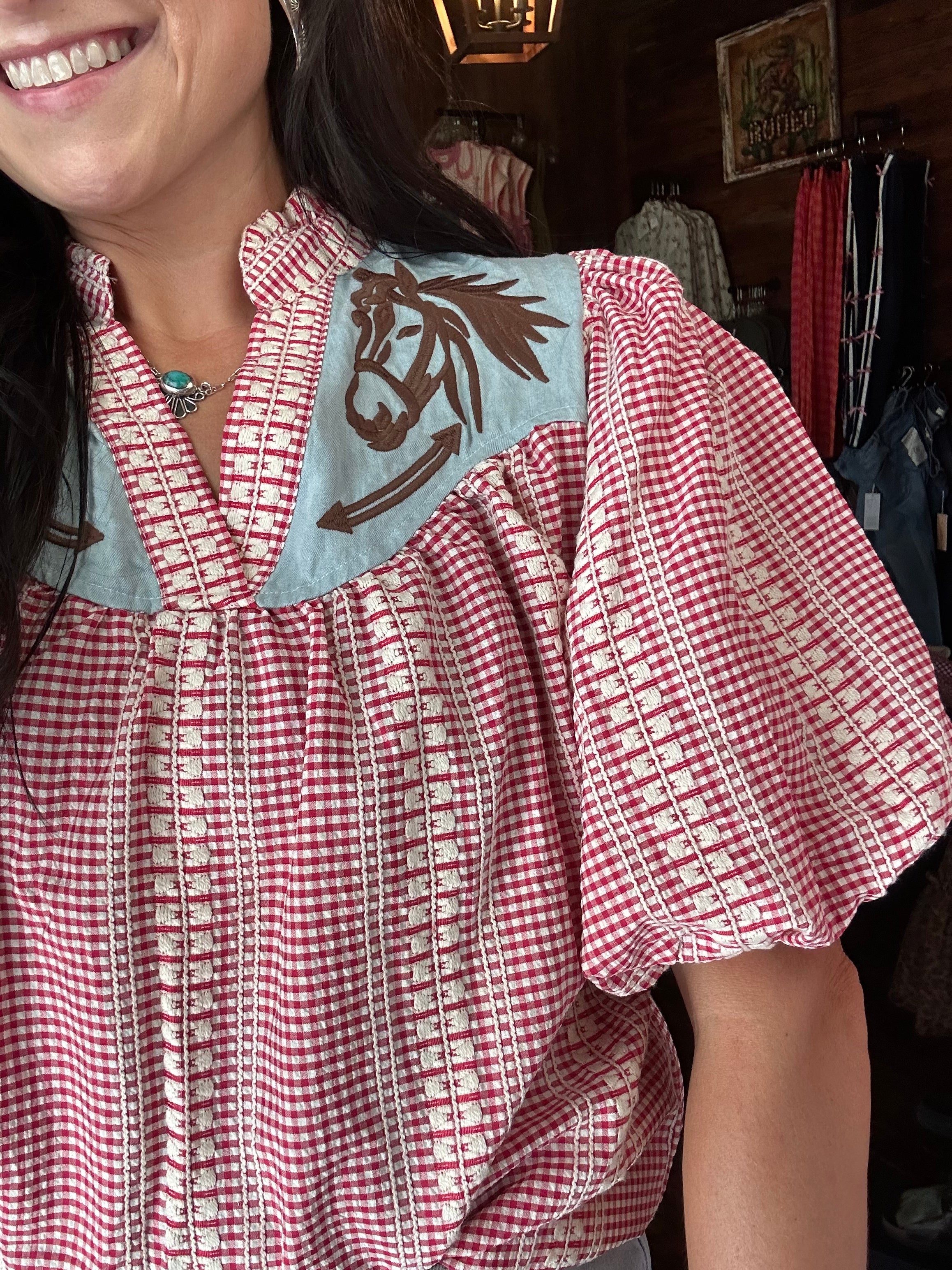Gorgeous gingham checked seer sucker and embroidery 🤩🤩. Peep those embroidered horse head details.Â