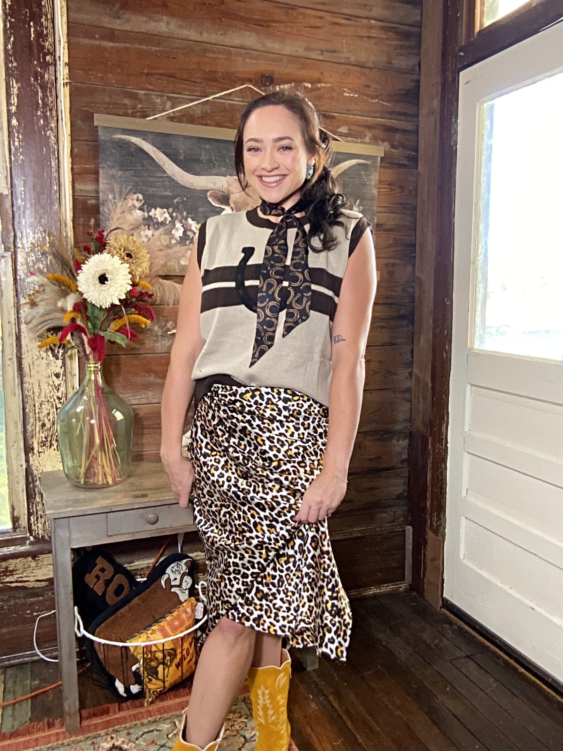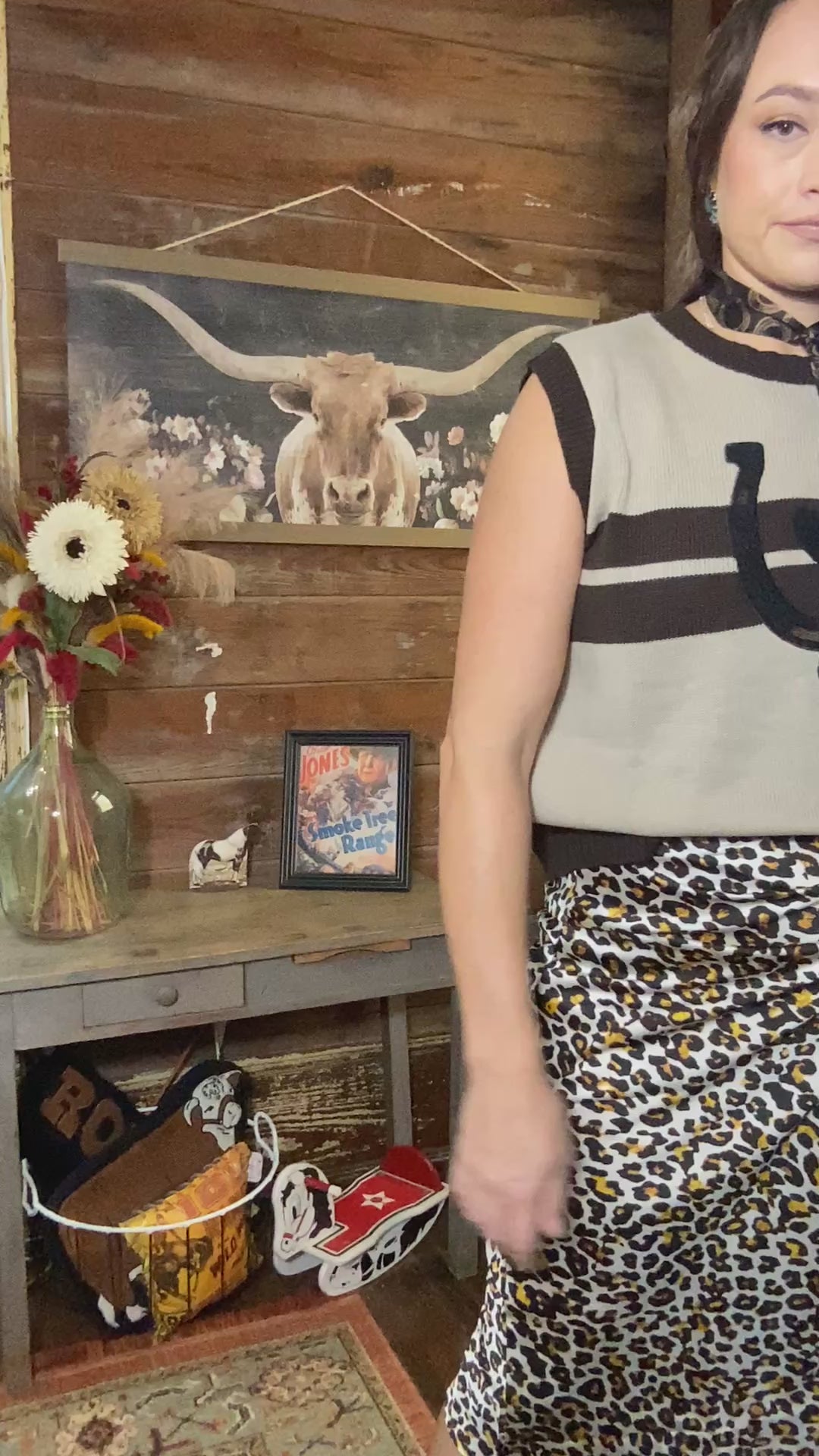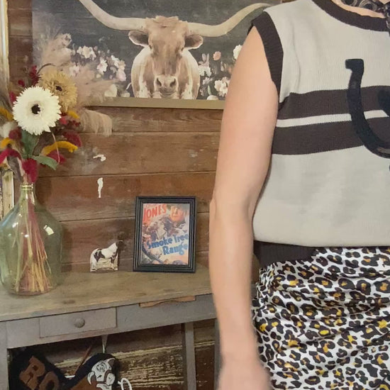 Oatmeal color with dark chocolate details and a horse shoe embroidered center
