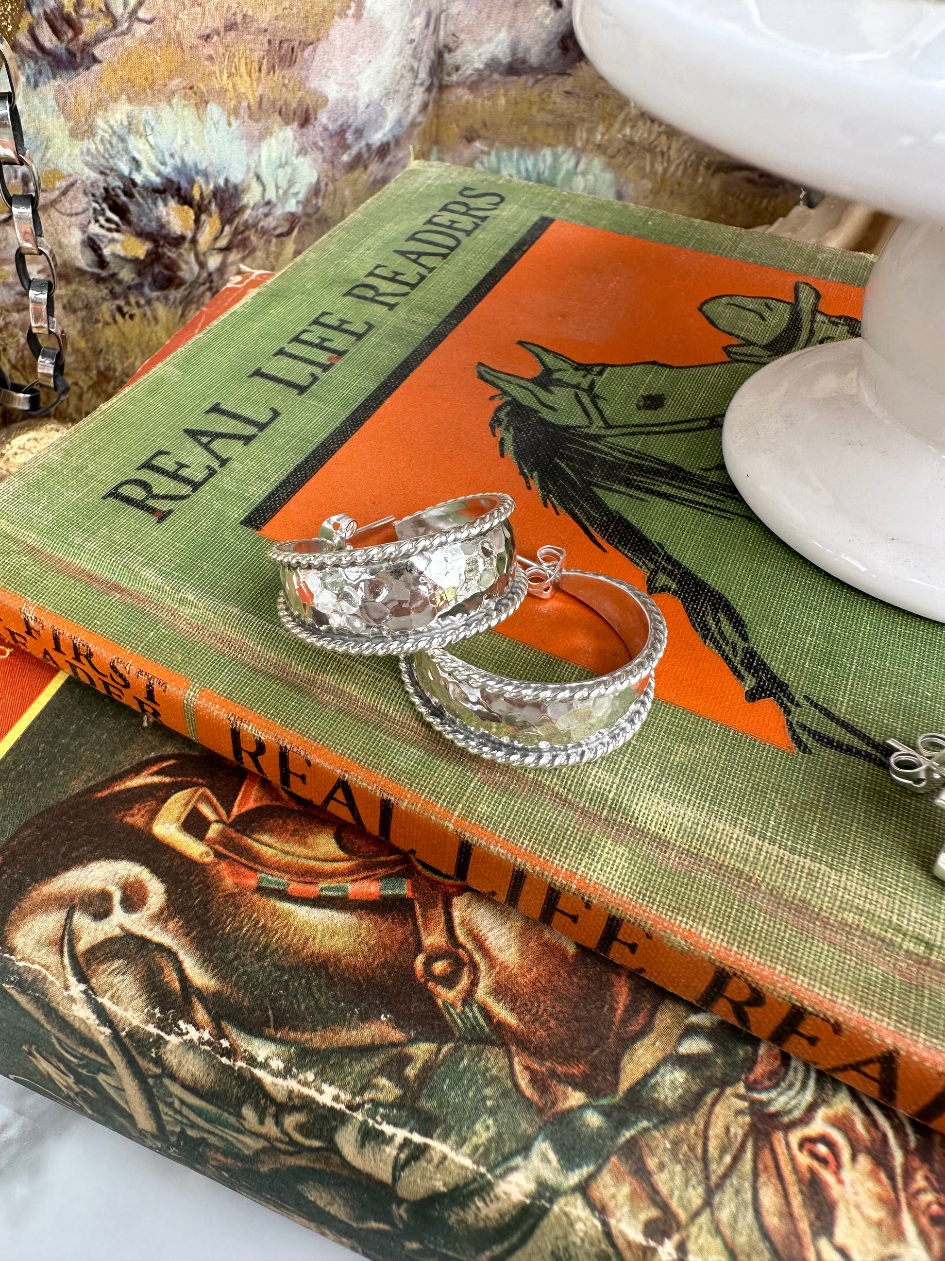 Beautiful Sterling Silver hammered hoop earrings with rope edge details