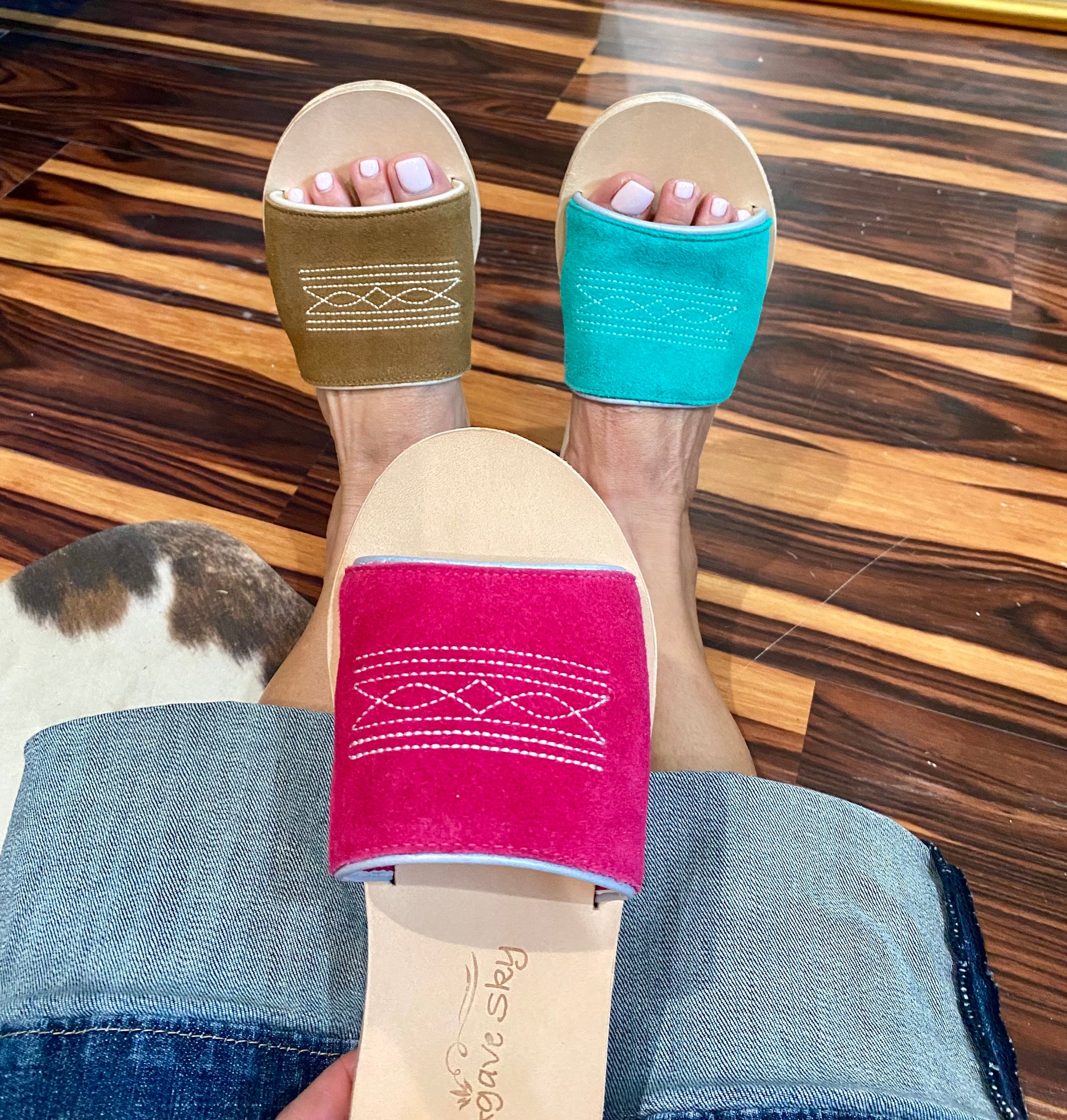 Dyed rough out leather slides with boot stitching. Sold is leather as well.