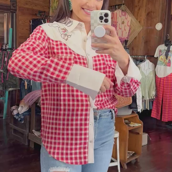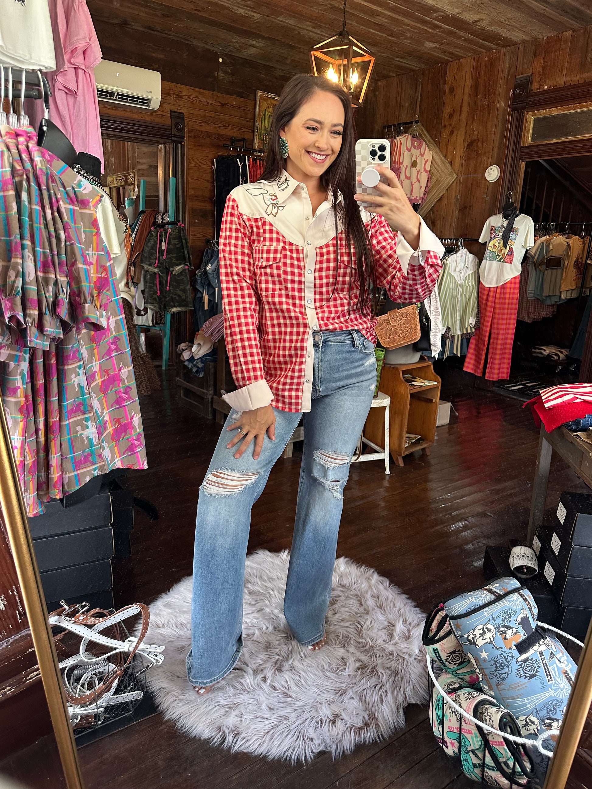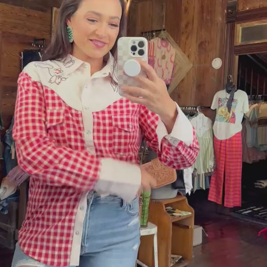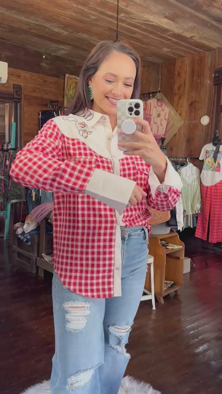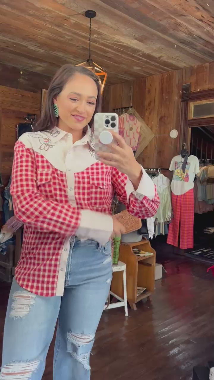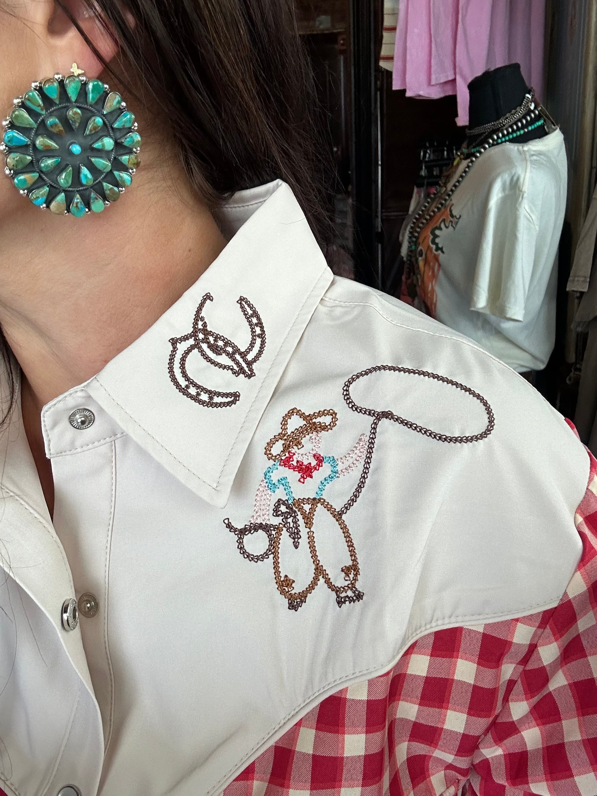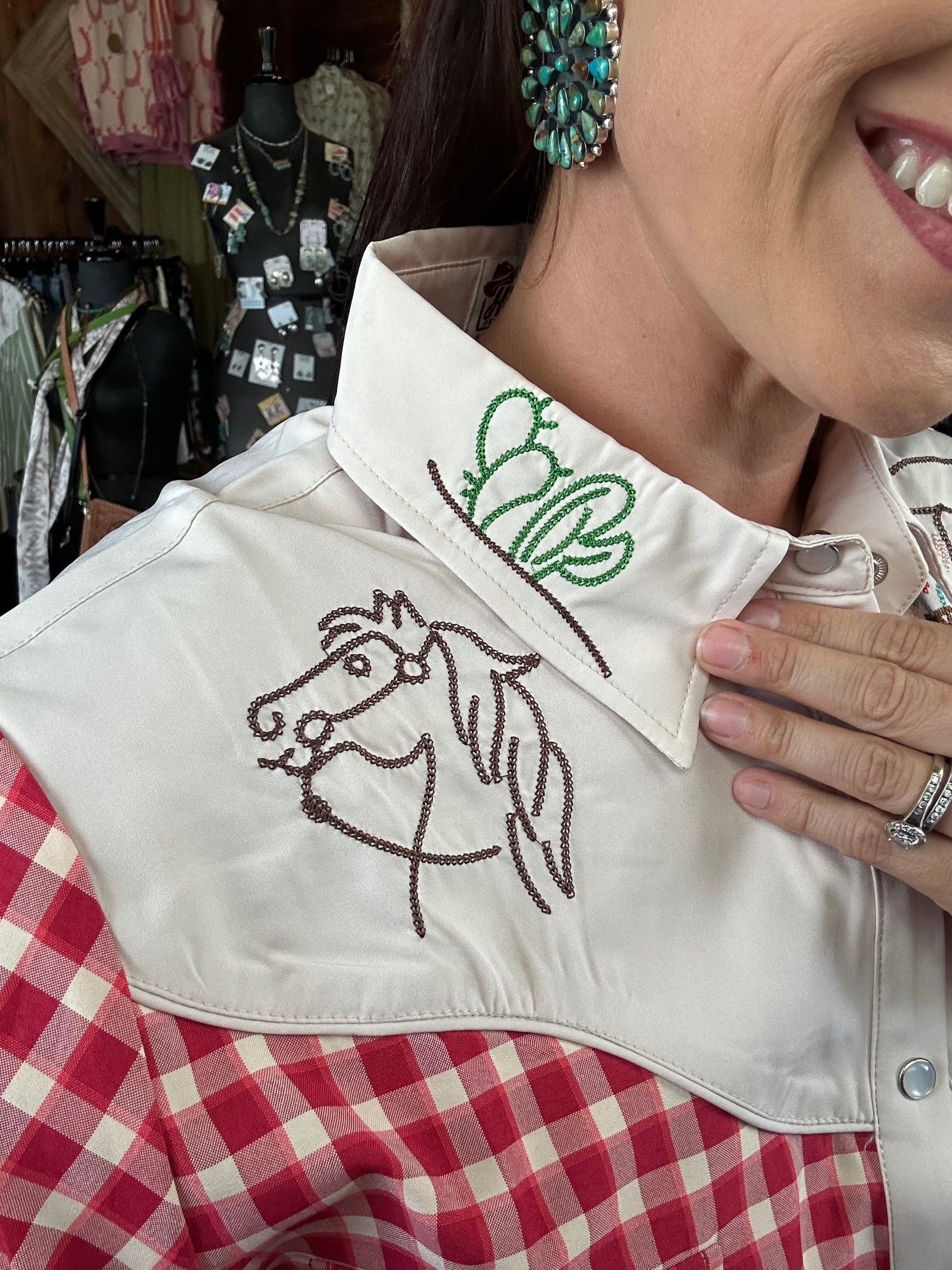 The cutest red gingham western pearl snap with super fun western insignia embroidered on the yoke and collar.