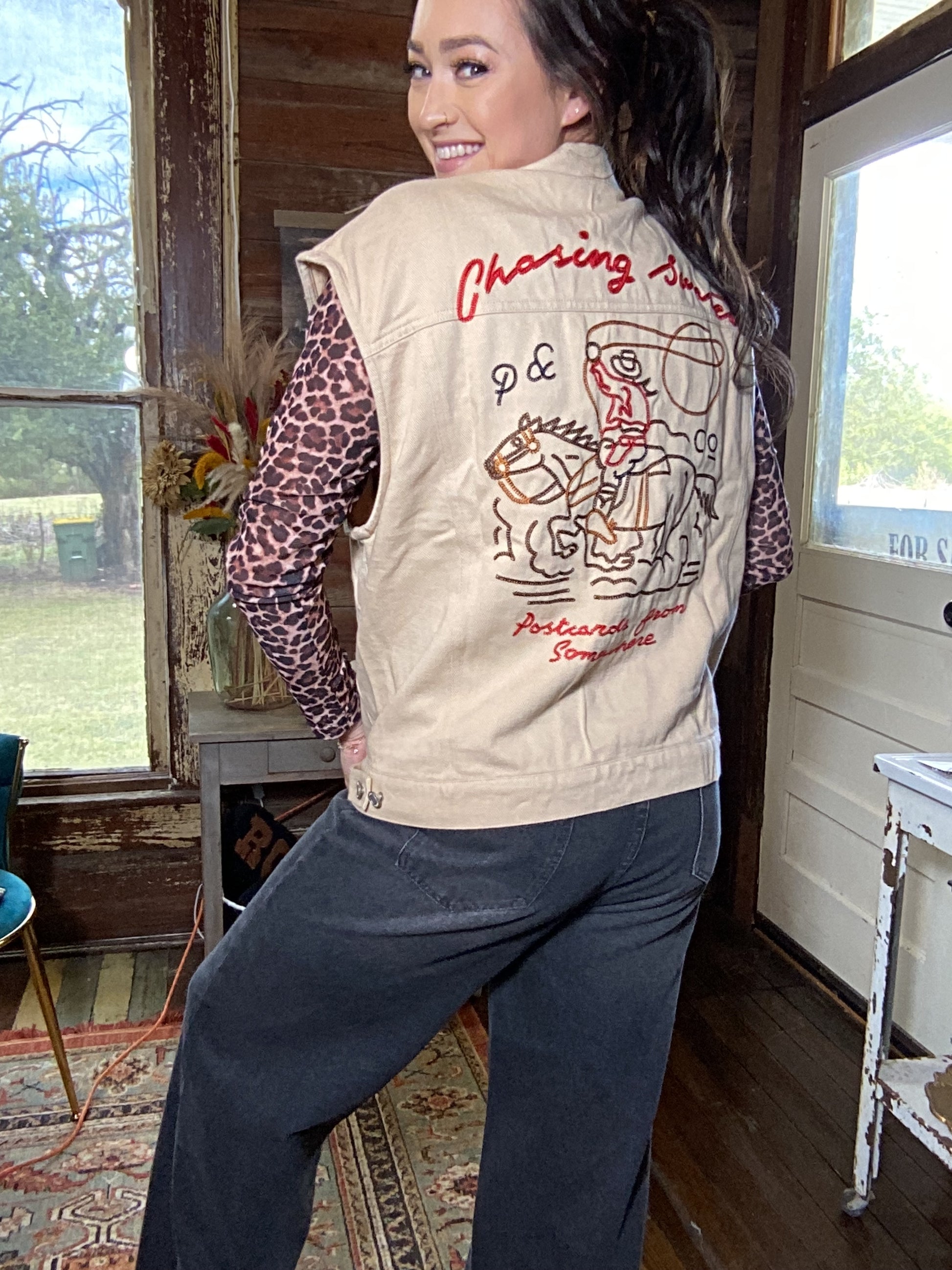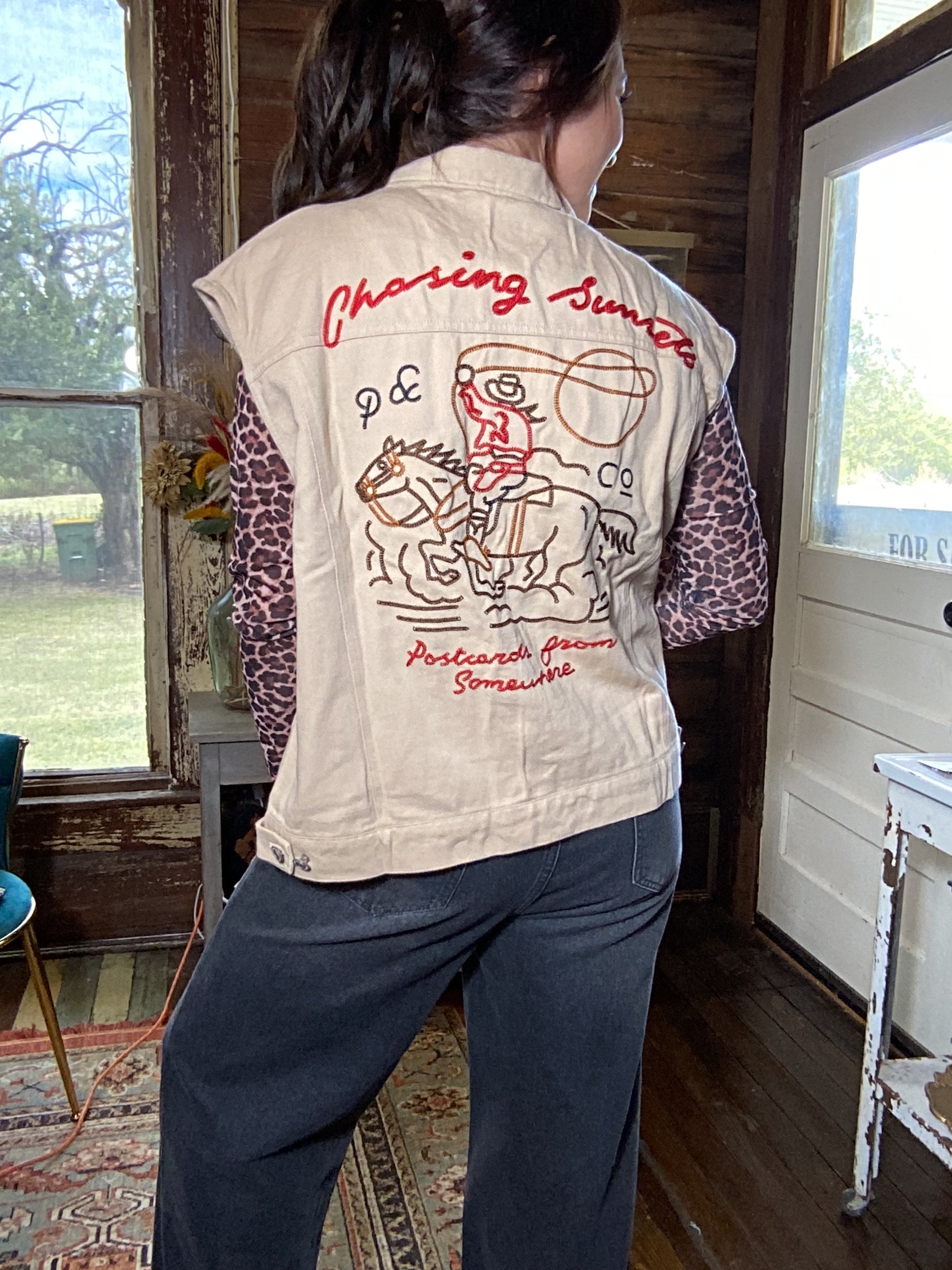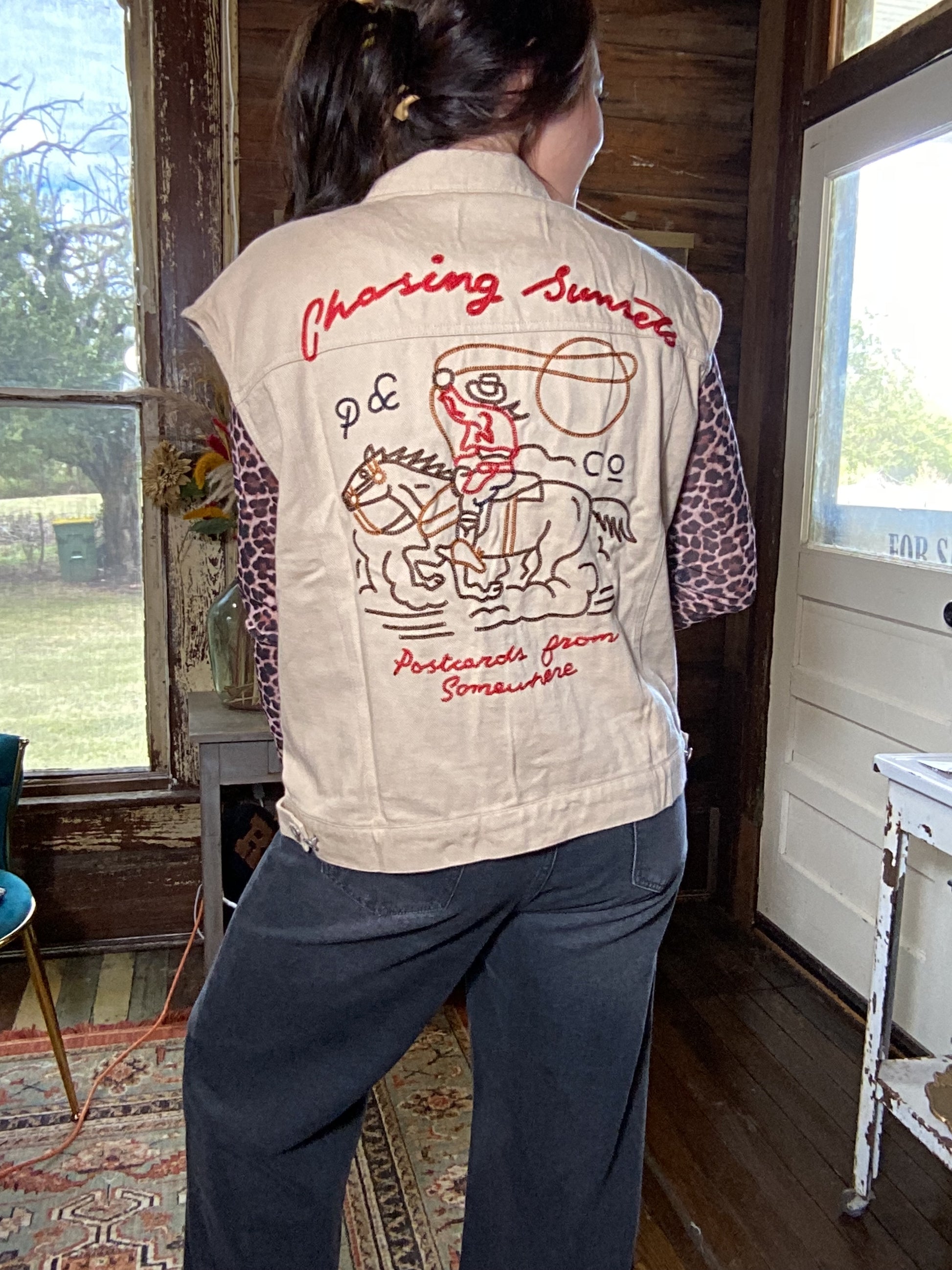 Ivory denim vest embroidered with the sweetest western scene on the back.