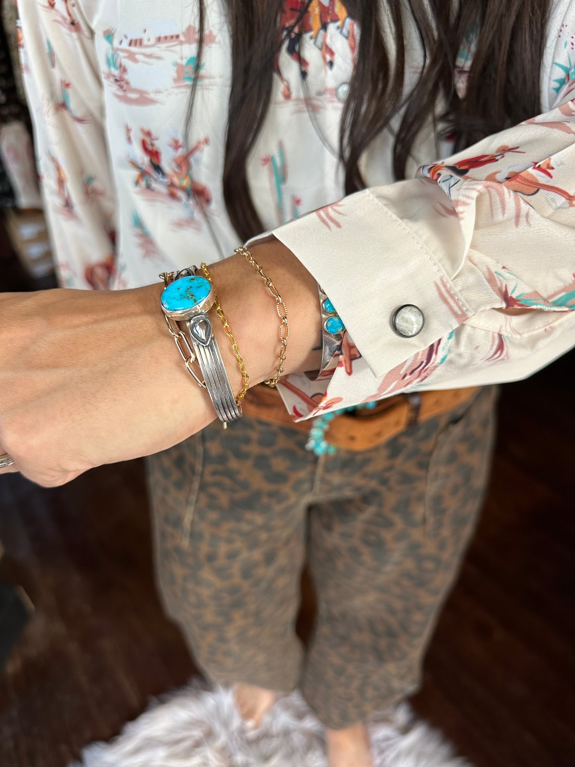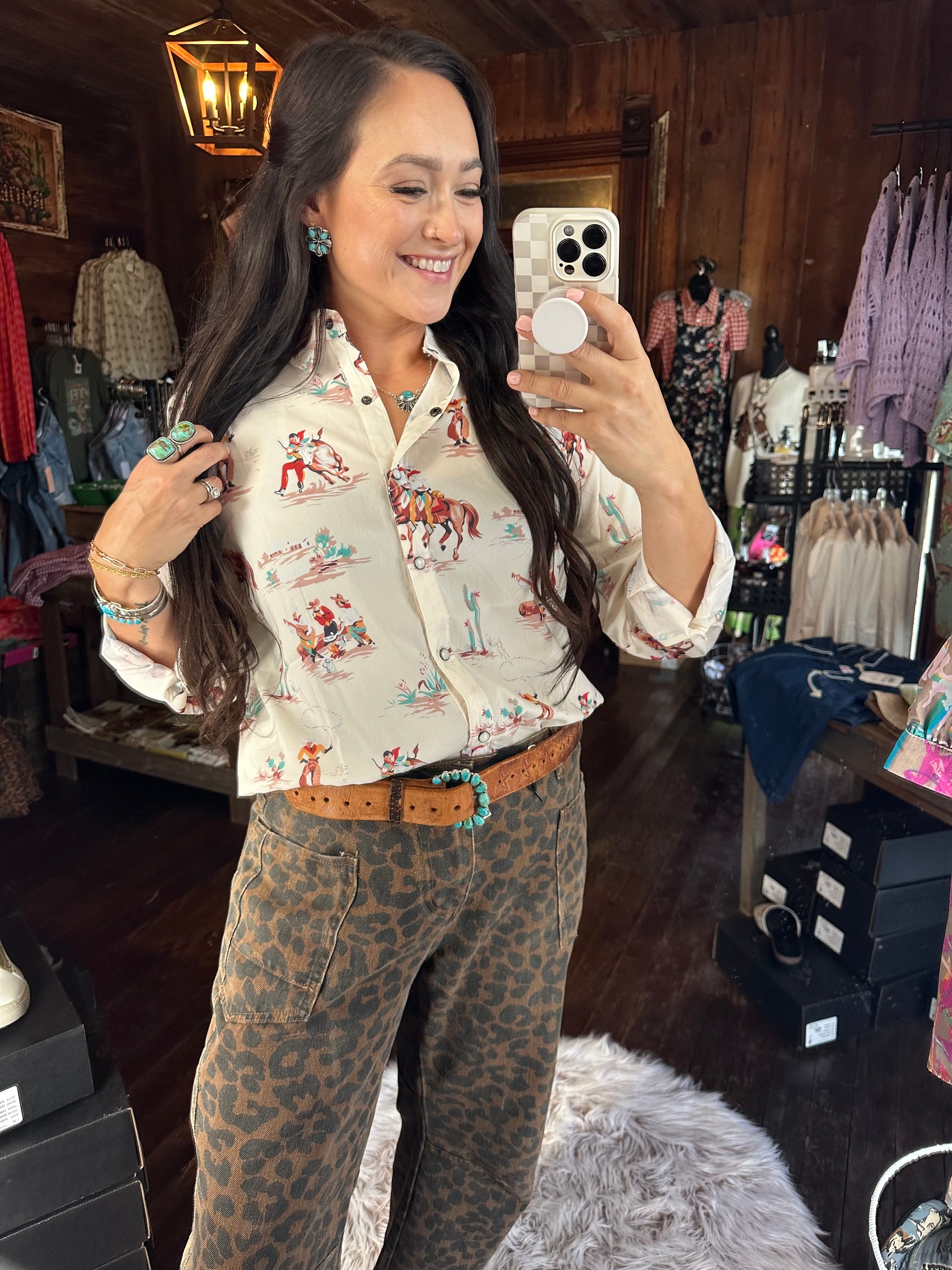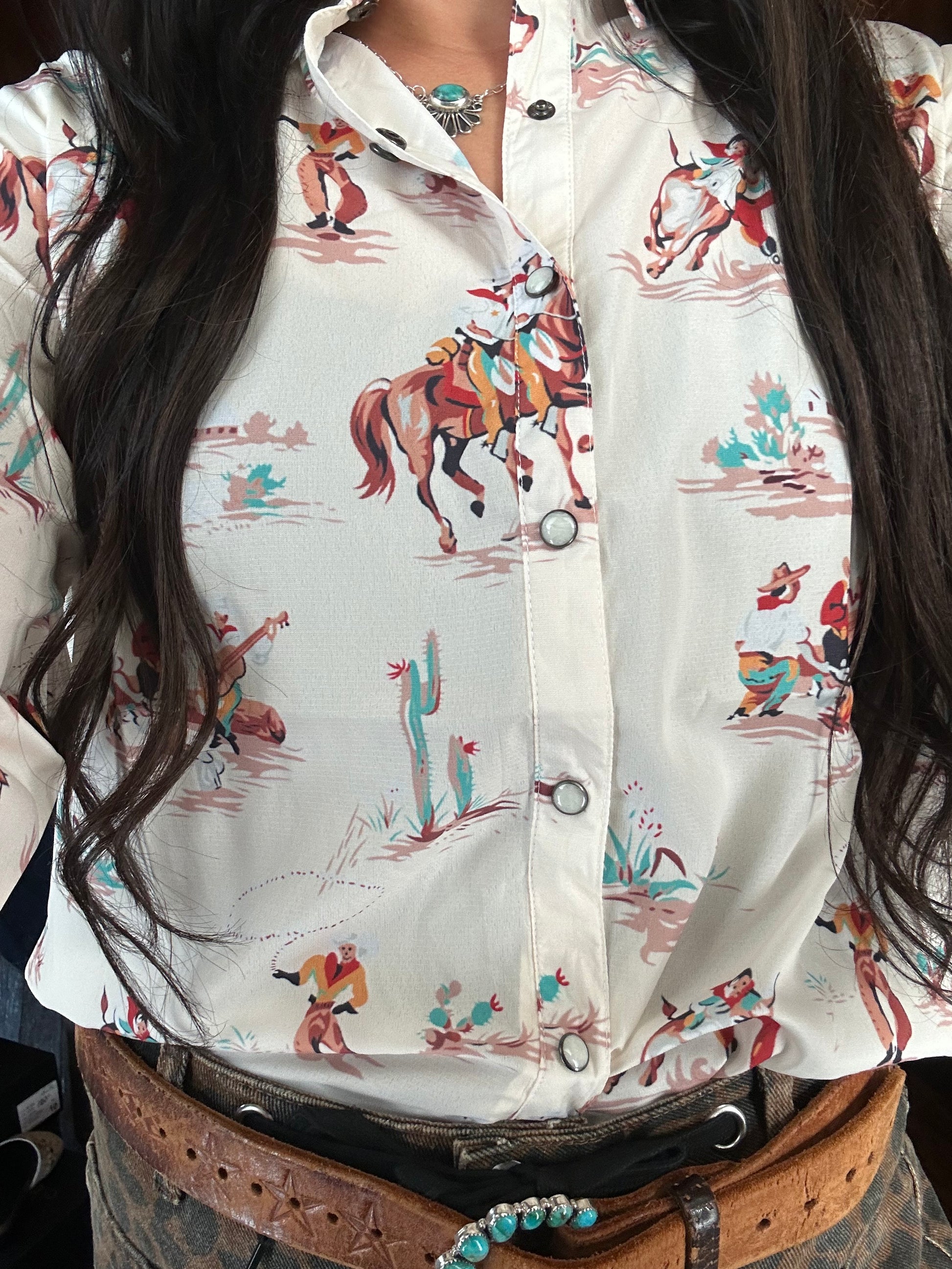 Western print pearl snap blouse