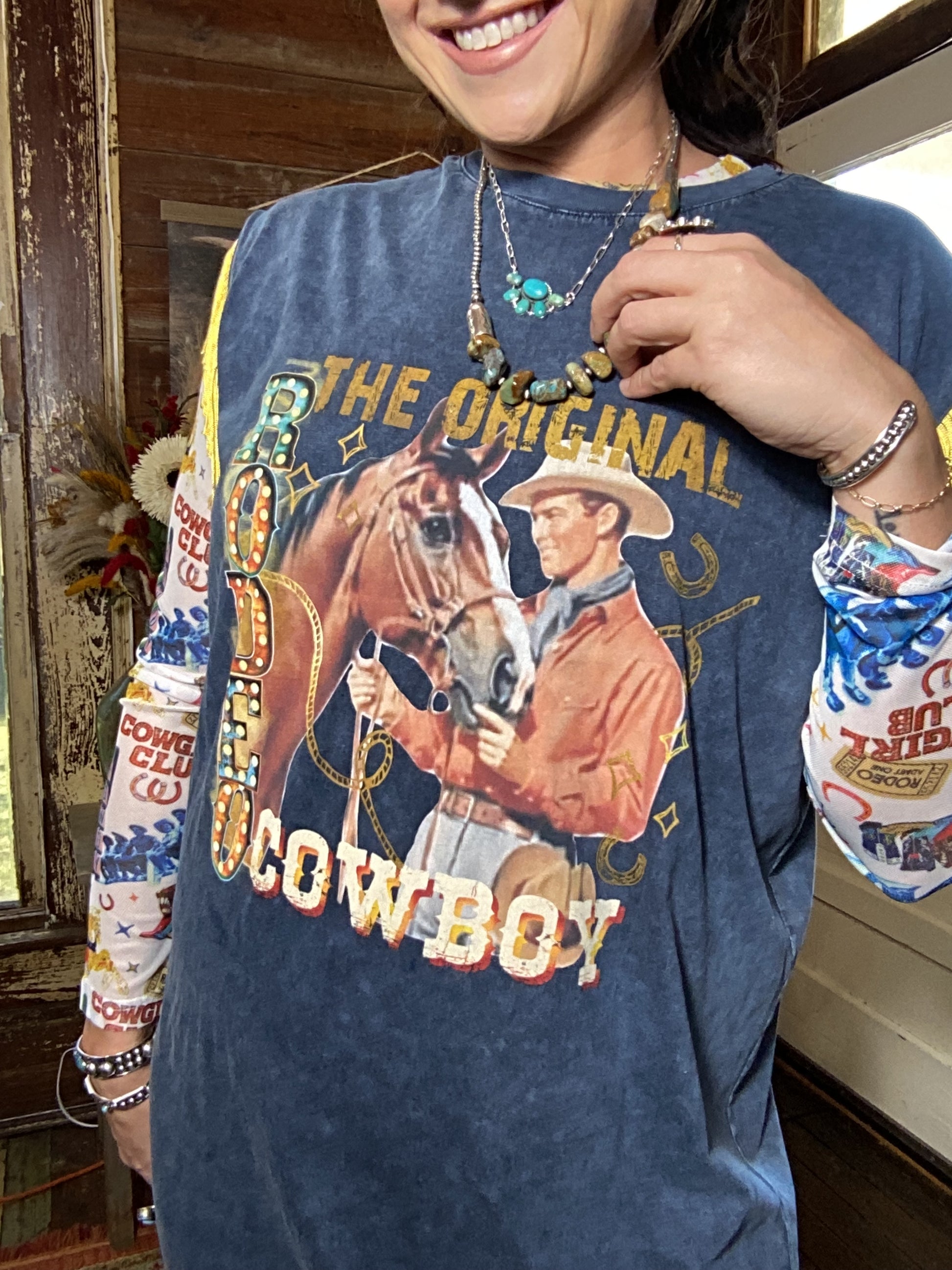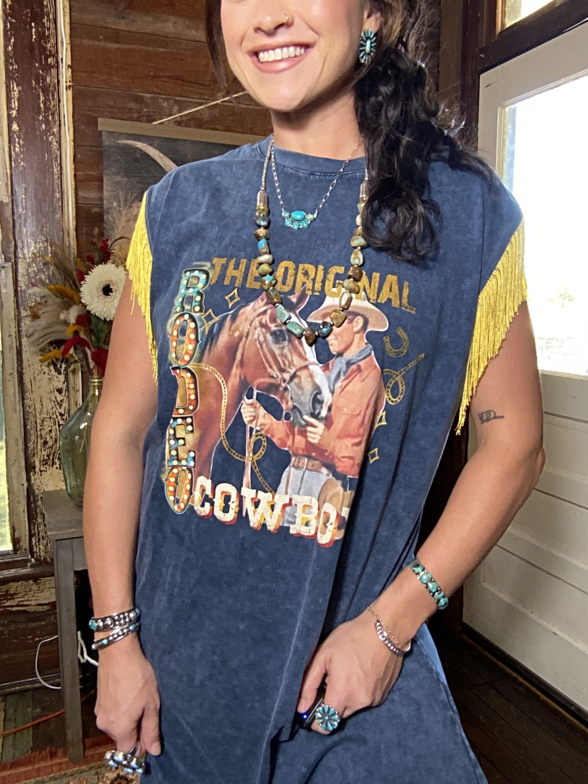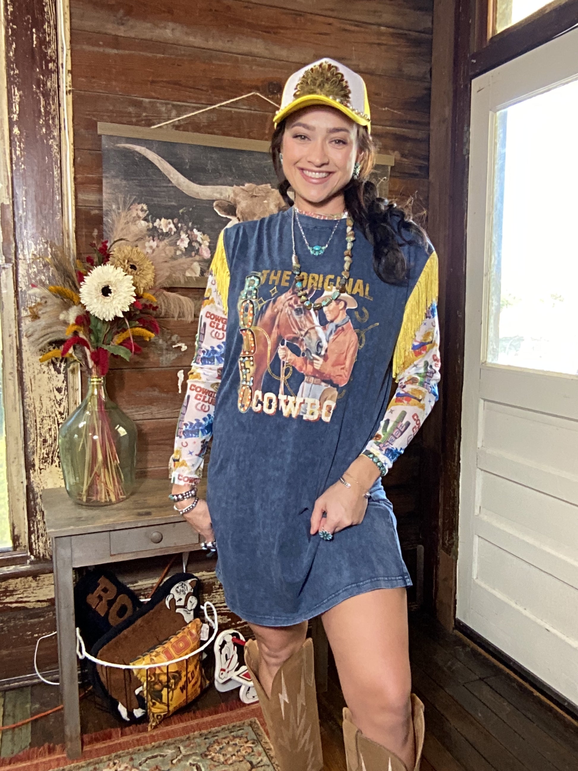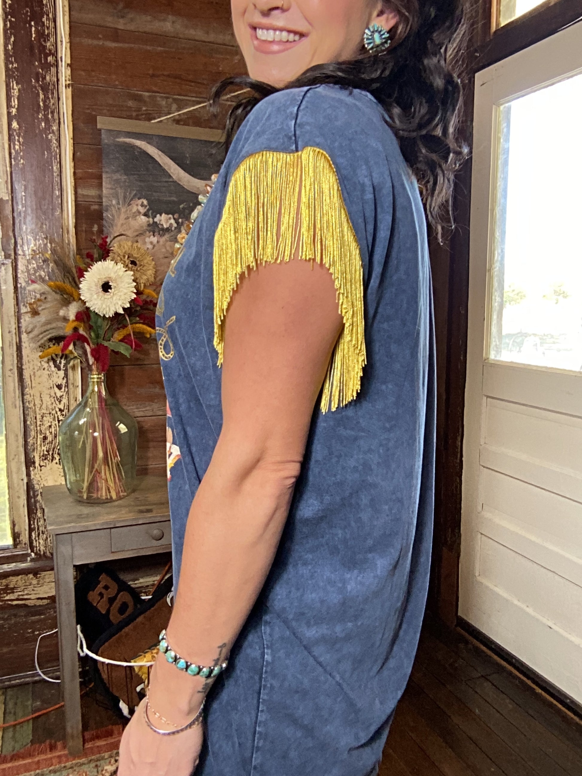 Navy t shirt dress with old school cowboy vibes accented by gold fringe sleeves 🤩🤩