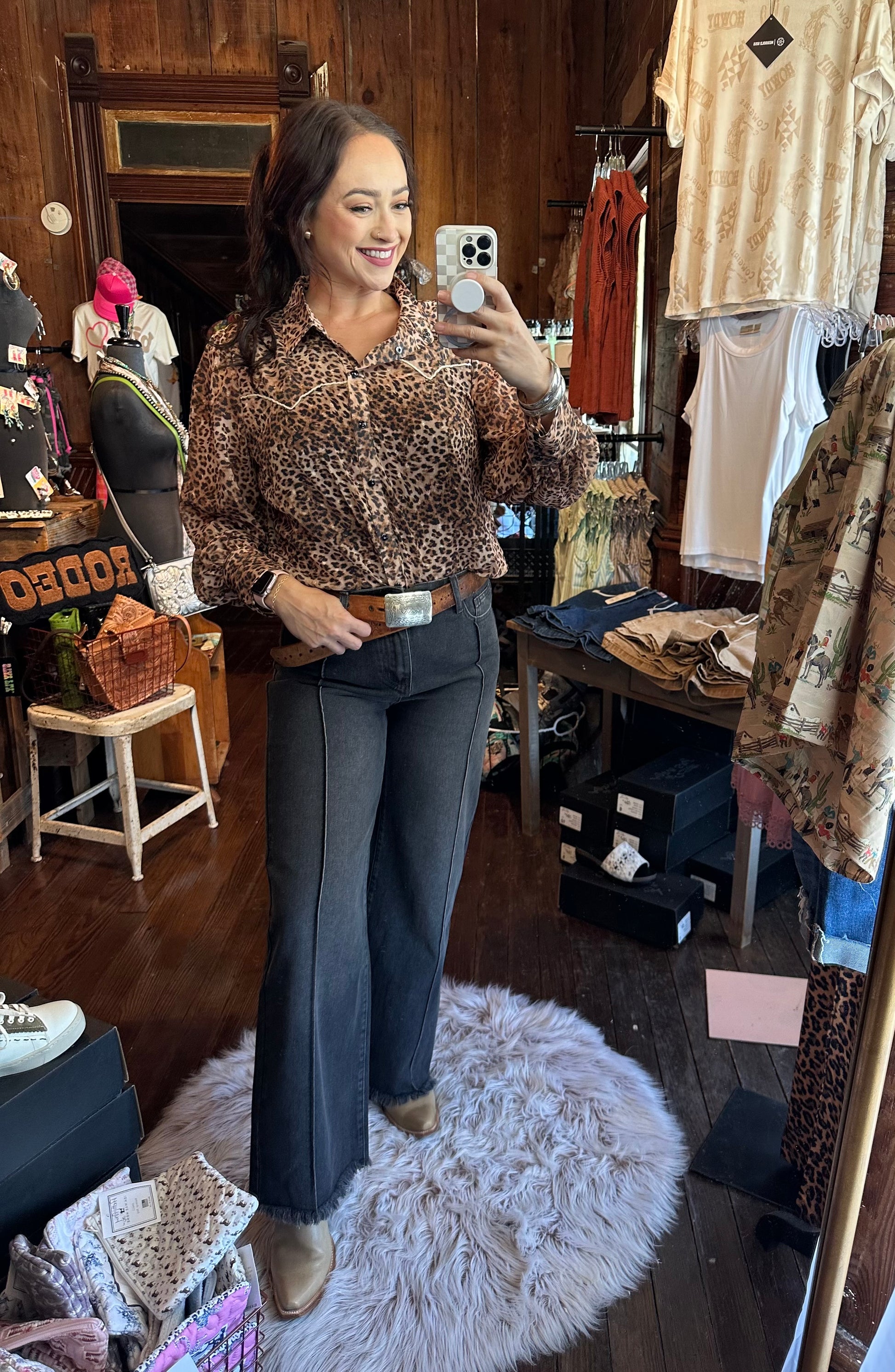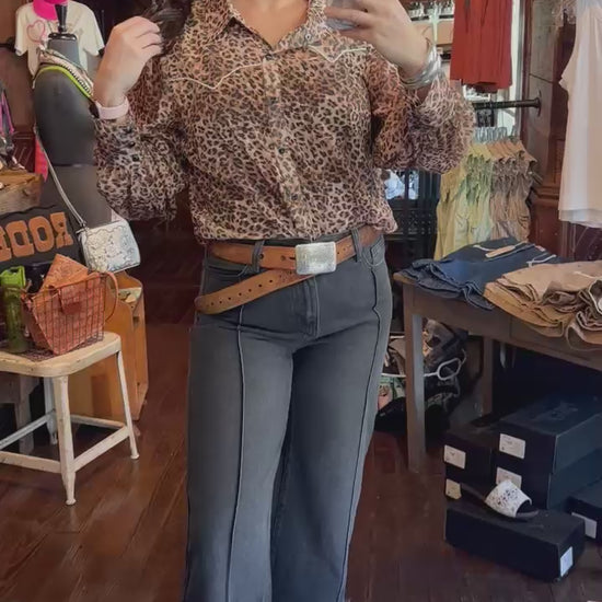 Sheet leopard black pearl snap blouse with decorative rope yoke on front and back.